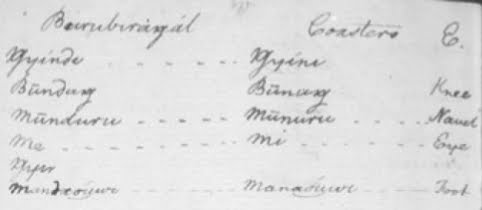 The above extract from Dawes’ Notebook (b) comes from the SOAS internet address cited. The Burubirangal were an ‘inland’ or ‘woods’ clan of the Biyal Biyal Sydney language group, while the ‘Coasters’ were the people around the harbour. What Dawes was mainly recording in his brief comparative list was not so much the insertion of ‘n’ but the dropping of ‘d’ by the ‘coasters’, in all but the fourth and fifth entries.